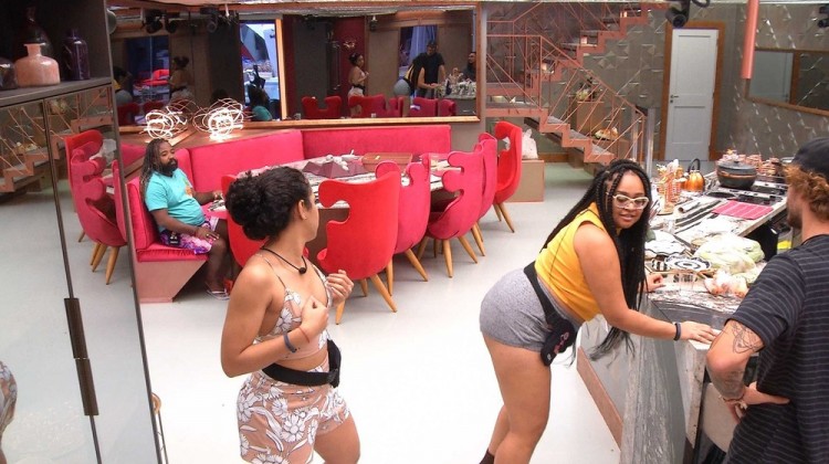 A confinada se apoia na bancada e mexe a cintura, fazendo movimentos circulares. O brother de Criciúma lembra do passo que a participante fez no chão. Rízia não tem dúvida e repete a dança no chão. O grupo se diverte com o passo e a sister dispara: "Minha mãe não sabe que eu faço essas coisas".