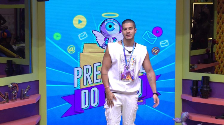 Com todos reunidos na sala do BBB 22, o Anjo da semana Arthur Aguiar escolhe quais brothers irão acompanhar para o Almoço do Anjo. O ator lê a carta: 'Presente do Anjo. Olá, Arthur! Convide, agora, três participantes para curtir com você".