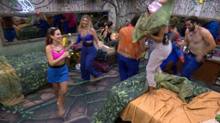Alguns participantes invadem o Quarto Gnomo do BBB 24 para cantar. , , , , e cantam músicas do Carnaval durante a invasão ao quarto em que , e estão.
