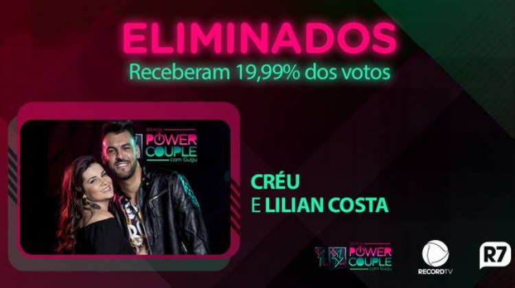 Fim de jogo para Créu e Lilian. Com 19,99% dos votos, o casal foi eliminado do Power Couple Brasil, no programa desta terça-feira (29). Créu e Lilian foram para a DR com o pior resultado da semana e enfrentaram Marlon e Letícia e Tati e Marcelo. Eles deixaram o reality show após a votação popular no Portal R7.